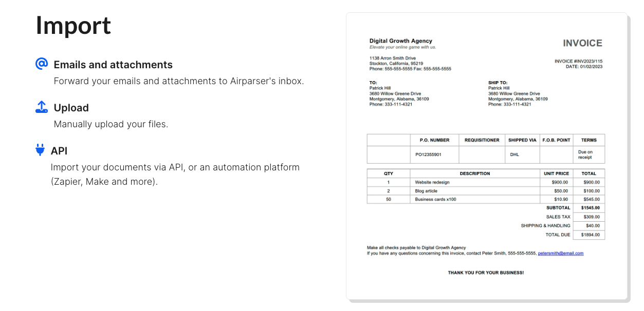 应用案例: Airparser在各种实际应用中具有广泛的用途。人工写的电子邮件和文本消息可以轻松提取签名、联系信息、日期和关键细节。手写的笔记可以数字化,将它们转化为有组织且可操作的数据。对于发票、收据和采购订单,Airparser可以高效地捕获金额、日期、订购物品和供应商信息。CV和简历中的重要细节,如姓名、联系信息和工作经验,也可以轻松从中提取。合同中的条款、当事人和关键数据可以自动提取,以简化合同管理流程。订单确认文件中的订单号、物品和交货细节的提取,可以优化订单处理流程。