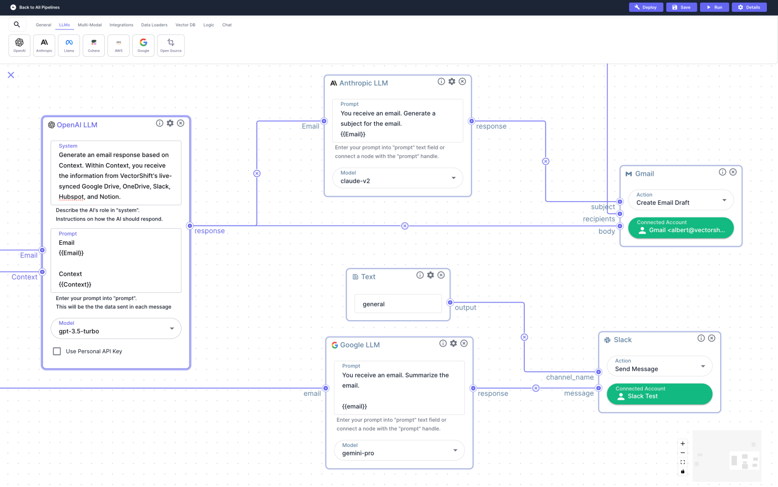 VectorShift称,它所使用的无代码方法将数据、工具和LLMs集成在一起,可以帮助各种应用,包括使用基于人工智能的搜索增强内部产品,这可以让团队通过自然语言查询从文档应用(如Notion)中检索信息。在另一种情况下,它可以帮助自动化跨应用程序的基于触发器的操作,比如针对特定查询生成的GPT-4的个性化电子邮件。