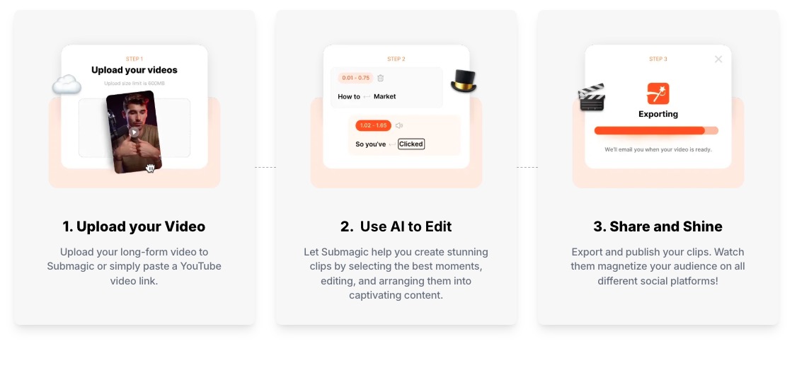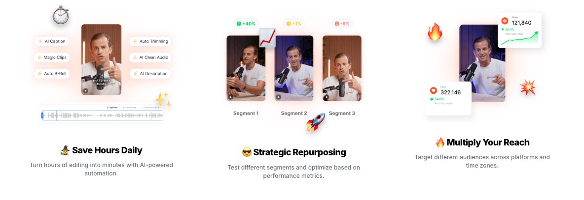 有这样一款强大的工具,它能够瞬间将长视频转变为夺人眼球的短视频,无需繁琐的人工编辑。其操作流程简单便捷,只需三步:首先,用户可以上传自己的长视频,或者直接粘贴 YouTube 视频链接;接着,借助 AI 的力量,它能够精准地筛选出视频中的精彩瞬间,完成剪辑并巧妙地将其组合成极具吸引力的内容;最后,将制作好的剪辑导出并发布,这些剪辑便会如磁石般吸引各个社交平台上的观众。