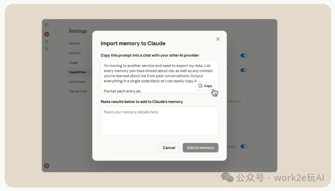 而作为消费者,你说有一个工具,可以把我以前花了几个月时间和另外一个AI产品进行磨合的经验和工作方式,通过一个简单的copy指令,就能迁移到一个新工具里,自然是很方便的。毕竟老是冲头再来一次也麻烦。