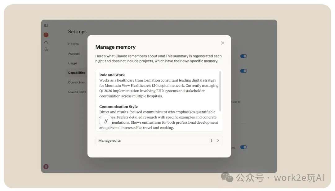当然,它这个功能是不错的,可以主动设置Claude的记忆到Memory里,同样按照它自己的原话:可以把在其他AI大模型里的信息和偏好带到Claude里,让切换工具后可以无缝对话。